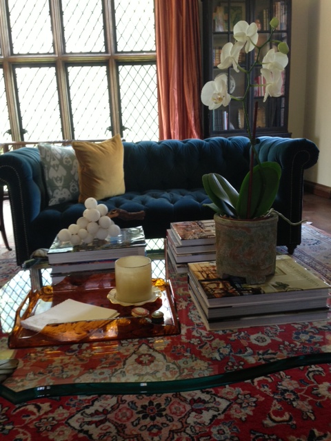 On the coffee table we stacked lots of big books, they all have beautiful photography and interesting subjects. We added an orchid in an old pot with a green patina that is easy to maintain. There is a faux tortise tray with a candle and some pretty monogrammed cocktail napkins.