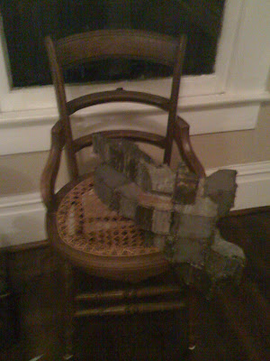 This horrendous photo is of a cane seat chair with a broken seat. I’m a sucker for cane. I’m thinking of wallpapering my powder bath in a cane wallpaper. This chair was also $20 from a garage sale. It obviously needs re-caning, and re-staining. That metal blob on top of it is this great sculpture we have of New Zealand, I gave it to Tim as a wedding gift. It’s probably going to look a bit better on the wall, when the room is painted! Stay tuned…